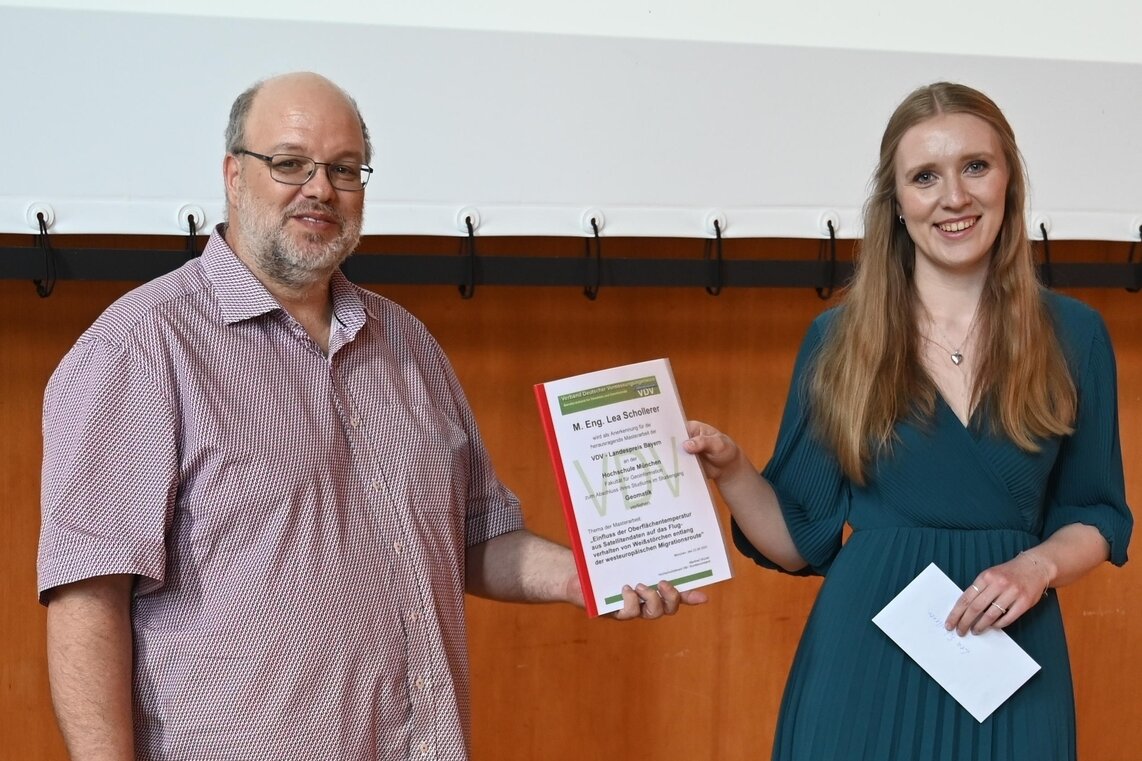 Preisträgerin des VDV-Landespreises Bayern war Frau Lea Schollerer mit ihrer Masterarbeit mit dem Thema: Einfluss der Oberflächentemperatur aus Satellitendaten auf das Flugverhalten von Weißstörchen entlang der westeuropäischen Migrationsroute. Diese erfolgte in Zusammenarbeit mit dem Deutsches Zentrum für Luft- und Raumfahrt Oberpfaffenhofen. Störche nutzen die Thermik, um beim Fliegen Energie zu sparen. Das wurde auch schon durch Telemetriedaten und statische Parameter wie Reliefeigenschaften untersucht. In dieser Arbeit wird untersucht, ob kleinräumige Temperaturvariationen, abgeleitet aus Satellitendaten, als Variable für das potenzielle Vorhandensein von passivem oder aktivem Flug genutzt werden können. Mit der im Rahmen dieser Arbeit getesteten Kombination aus LST-Variablen und Telemetriedaten konnte erstmals gezeigt werden, dass aus Satellitendaten abgeleitete LST-Informationen potenziell geeignet sind, um den Einfluss von thermischen Aufwinden auf das Flugverhalten von Zugvögeln zu untersuchen.