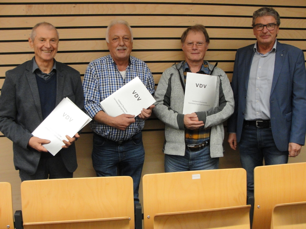 Nach dem Geodätischen Kolloquium an der FHWS überreichte der Vorsitzende des VDV-Landesverbands Bayern, Frank Pöhlmann, die Ehrenurkunde und die silberne Verbandsnadel mit Kranz an Johann Rackl, Richard Öchsner und Helmut Werthmann.