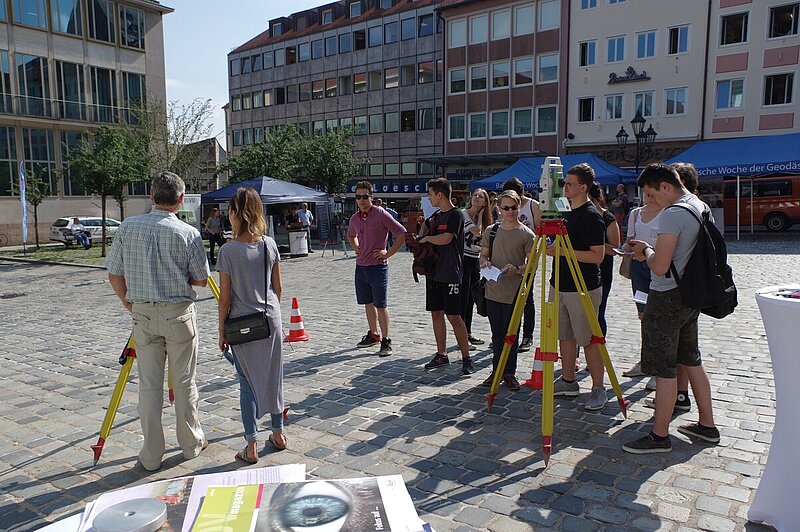 Am 18. Juli 2016 fand in Nürnberg die Auftaktveranstaltung zur diesjährigen „Bayerische Woche der Geodäsie“ statt. Kern dieser Veranstaltung war es, Schülern weiterführender Schulen die Möglichkeit zu geben, das Berufsfeld des Geodäten in all seinen verschiedenen Bereichen kennenzulernen und somit das Interesse an einem entsprechenden Studium oder einer Ausbildung zu wecken. So wurden im Vorfeld der Veranstaltung Informationen an die Schulen der Metropolregion Nürnberg verteilt. Zahlreiche Klassen folgten der Einladung und wurden dann durch ein GPS-Handgerät zu den einzelnen Ständen geführt, wo Sie mit einem GeoQuiz spezielle Fragen beantworten mussten, dass als Lösungswort das diesjährige Motto „Wir vermessen die Welt“ ergab.