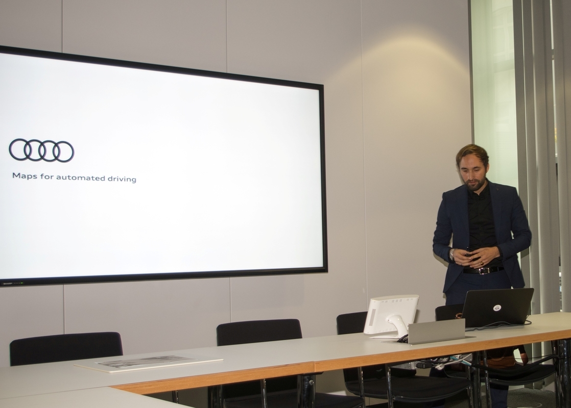Pünktlich um 10 Uhr fanden sich alle Exkursionsteilnehmer im Gebäude "Markt und Kunde" des Audi Forum Ingolstadt ein, wo sie von Florian Haubner (Audi Electronics Venture GmbH) in Empfang genommen wurden. Auftakt des Programms war ein Fachvortrag von Herrn Haubner mit dem Titel „HD Karten für automatisiertes Fahren“, welcher den Teilnehmer einen umfassenden Überblick über das Thema des automatisierten Fahrens im Allgemeinen, den Entwicklungsstand bei der AUDI AG und der Einbindung von hochpräzisen Karten in diese Entwicklungsansätze im speziellen gab. Statistisch werden 90% der Verkehrsunfälle durch das Fehlverhalten des Menschen verursacht, so dass es ein konsequenter Schritt zu mehr Verkehrssicherheit ist, diesen Faktor auf ein Minimum zu reduzieren. Das Thema automatisiertes Fahren, beschäftigt die Autoindustrie schon seit langem. Bereits 1954 wurde mit dem Konzeptfahrzeug Firebird II von General Motors ein Fahrzeug vorgestellt, das erste Funktionalitäten zum automatisierten Fahren besaß. Der neue Audi A8 ist nun im Jahr 2017 das erste Serienauto der Welt, das für hochautomatisiertes Fahren auf Level 3 nach den internationalen Standards konzipiert ist. Die Klassifizierung der Systeme erfolgt an Hand des Automatisierungsgrads nach der Norm SAE J3016. Bei den Systemen des Levels 1-2 handelt es sich um reine Assistenzsysteme, bei denen der Fahrer weiterhin in der vollen Verantwortung ist, das Fahrzeug zu kontrollieren. Solche Systeme, z. B. Parkassistent, Abstands- und Spurhalteassistent, haben bereits in der Serienproduktion Einzug gehalten. Bei Level 3, für welches der neue Audi A8 ausgelegt ist, und Level 4 liegt bereits eine Teilautomatisierung vor, bei welcher der Fahrer lediglich in Situationen die das Handlungsvermögen der Systems übersteigen, eingreifen muss. Level 5 würde eine Vollautomatisierung in allen Fahrsituationen bedeuten, der Mensch ist nur noch Passagier. Bei Audi sieht man sich grundsätzlich vor drei Herausforderungen gestellt: Die Wahrnehmung der Fahrzeugumgebung, die automatisierte Planung der korrekten Handlung und die unmittelbare Umsetzung der Handlung durch die mechanischen Komponenten des Fahrzeugs. Das Wahrnehmen der Fahrzeugumgebung beinhaltet zum einen die Positionierung des Fahrzeugs in seiner Umgebung und zum anderen das Erkennen von anderen Fahrzeugen/ Hindernissen und deren Bewegungen. Hierzu sollen Radarsensoren, Kamera- und Laserscansysteme eingesetzt werden. Als Zusatzinformation werden für die Positionierung des Fahrzeugs hochauflösende Kartenwerke hinterlegt, die deutlich über den in Navigationsgeräten bisher verwendeten Stand hinausgehen. Dieser Kartenstandard soll zukünftig ein sogenanntes Lane Model umfassen, welches spurgenau die Verkehrsführung, inklusive Sperrflächen und zusätzlich sogenannte Landmarks zur Positionierung beinhaltet. Darüber hinaus könnten noch weitere Metadaten, z. B. Wildwechselzonen, hinterlegt werden. Diese Karten werden derzeit von Kartenanbietern mittels Mobile-Mapping-Systemen erstellt. Eine Lösung zur Positionierung des Fahrzeugs in der Karte liegt in der permanenten Erfassung von Landmarken mittels der Fahrzeug-Sensorik. Darüber hinaus wäre es denkbar, dass die Fahrzeuge laufend zusätzliche Landmarken erfassen und auf dieser Basis die hochgenauen Karten aktualisiert werden. Bezüglich der Planung der Fahrzeugreaktion ist die Vision von Audi eine Kommunikation der gesteuerten Fahrzeuge untereinander (V2X Communication), wobei weiterhin das Verhalten aller Verkehrsteilnehmer mittels Sensorik wahrgenommen wird. Die mechanische Reaktion des Fahrzeugs muss anschließend direkt und kurzfristig umgesetzt werden. Hier wird ein intuitives User-Interface als essentiell gesehen, das dem Fahrer die Handlungen des Fahrzeugs nachvollziehbar aufzeigt.