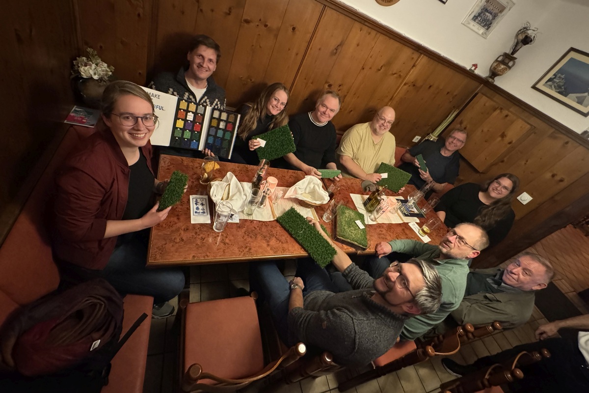 Am 11. November 2025, während anderswo die Jecken begannen durch die Straßen zu ziehen, traf sich der Bezirk Bayern-Süd beim Griechen in Feldkirchen zu einem gemeinsamen Stammtisch. Der Abend stand unter dem Thema „Vermessung im Sportplatzbau - Was muss an einem Sportplatz alles vermessen werden damit Weltrekorde gewertet werden!". Schon zu Beginn der Veranstaltung waren die Anwesenden begeistert von dem Thema und stellten viele Fragen, bevor Julia Lechner ihren Vortrag über die Arbeit bei der Firma Polytan überhaupt beginnen konnte. Polytan ist ein deutsches Unternehmen, das sich auf den Bau von Sportplätzen mit Kunstrasen und EPDM-Belägen (synthetischer Gummi, oft auch Tartanbahn genannt) spezialisiert hat. Schnell wurde klar: Sportplatz ist nicht gleich Sportplatz! Es gibt eine Vielzahl an verschiedenen Kunstrasenvarianten und mit den EPDM-Belägen können beliebige Farbkombinationen und sogar ganze Logos auf den Platz gebracht werden. Hierfür wird auch mal das Geschick der Vermesserin benötigt, um ausgefallene Muster abzustecken. Auch bei der Sicherstellung eines ebenen Platzes oder der Linierung der verschiedenen Sportarten ist die Vermessung gefragt. Die größte Herausforderung stellt aber die Realisierung der Rundlaufbahn dar. Nach festen Normen müssen hier Startpunkte und Positionen für Hürden markiert werden, damit darauf später einmal Weltrekorde gewertet werden können.