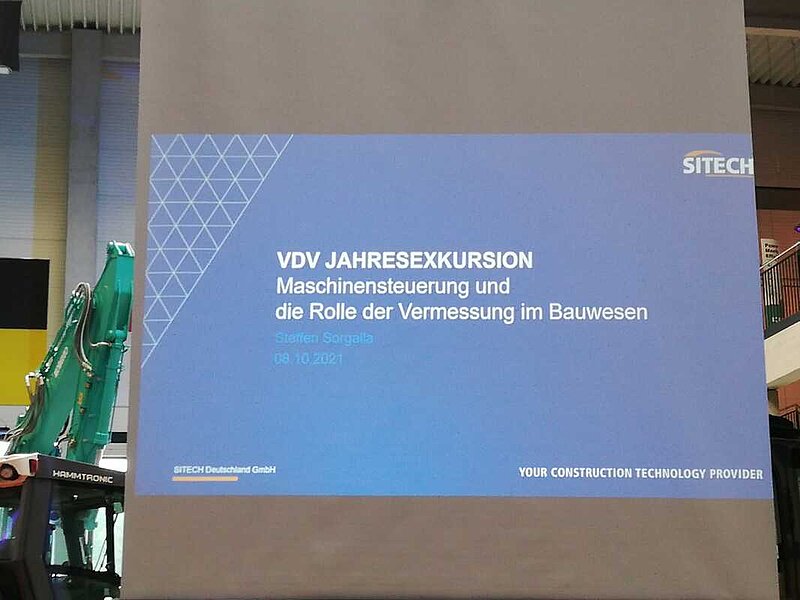 Steffen Sorgalla, stellte im Anschluss die Firma SITECH Deutschland GmbH vor. Sie ist exklusiver Vertriebspartner zu Lösungen für Positionierung und Baumaschinensteuerung von Trimble. Herr Sorgalla vom Standort Weiden ist zuständig für die Digitale Einsatzberatung und Maschinensteuerung. Er gab den Zuhörern einen Abriss über die technischen Entwicklungen der Baumaschinensteuerung. Diese begann bereits im Jahre 1963 mit dem Einsatz der Lasertechnologie, mit Geräten wie Laserplane von Spectra-Physics bzw. später Spectra-Precision. Im Jahre 2001 wurde die erste 3D-ATS-Steuerung für Grader entwickelt. Eingesetzt wurden damals die Steuerungsrechner GP2 / GP3 der Firma Wirth.
