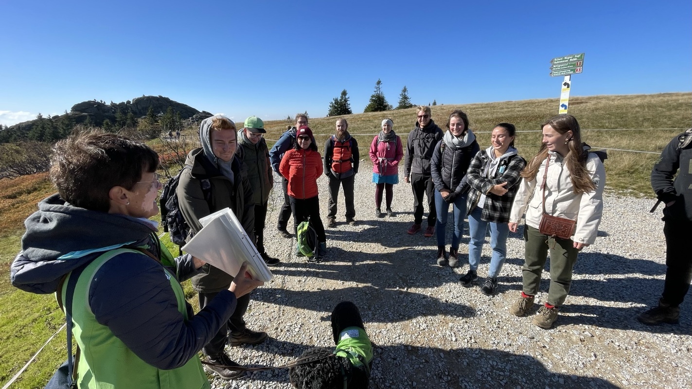 Anette Lafaire, die Gebietsbetreuerin Nationalpark Bayerischer Wald empfing uns mit ihrem Hund zu einer Wanderung um den Arbergipfel.