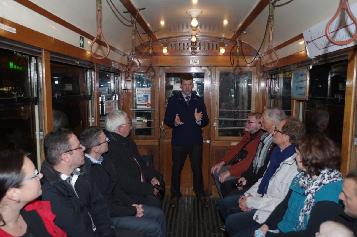Von der nächstgelegenen Straßenbahnhaltestelle ging es mit einer historischen Straßenbahn zum historischen Straßenbahndepot St. Peter. Die begleitenden Straßenbahnschaffner erzählten allerhand Wissenswertes zu den Besonderheiten der Straßenbahnen und der Streckenführung und zu den Nürnberger Sehenswürdigkeiten. Im Straßenbahndepot erwarteten die Mitglieder zum Abendessen echte Nürnberger Bratwürste auf Sauerkraut. Nach einer fachkundigen Führung im Depot mit Erläuterungen zur Entwicklung der Straßenbahnen in Nürnberg und der Welt, ging es dann wieder zurück.