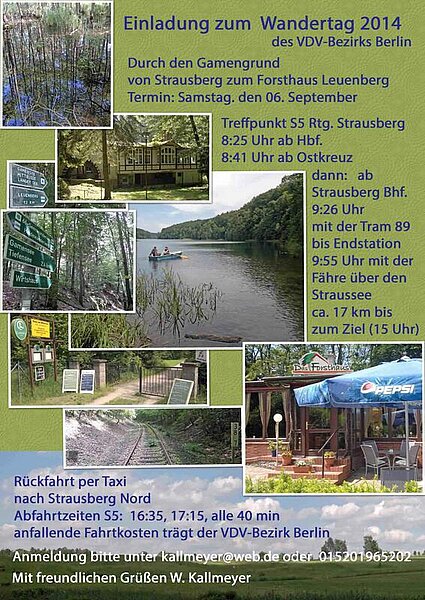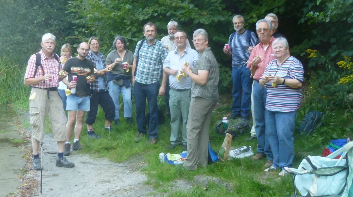 Am ersten September-Wochenende fanden sich 13 Wackere, der Zahl zum Trotz und dem Eisenbahnstreik die Stirn geboten, zum Wandern im Märkischen Oderland. Nach erfolgter Ankunft in Strausberg östlich von Berlin, musste das Programm, dem Streik nachfolgend, etwas gestrafft werden, wollten wir doch ohne großen Zeitdruck unser Ziel, das Forsthaus Leuenberg im Gamengrund zum gemeinsamen Essen erreichen. Deshalb wurde die erste Etappe, mit der Fähre den Straussee zu überqueren, durch eine Taxifahrt auf die andere Seeseite ersetzt. Der Wald empfing uns mit herbstlichen Tönen und angenehmen Wandertemperaturen, und nach dem ersten Abschnitt wurde eine Rast am Südende des Gamensee eingelegt. Hier überraschten uns der Organisator Wolfgang Kallmeyer und seine Frau mit hausgemachten Bouletten und Getränken. So gestärkt erreichten wir nach weiteren Kilometern zu einem Kaffee- und Kaltgetränkestop das Wirtshaus am Gamensee, um zum Schlussspurt im Forsthaus einzutreffen, bevor bei einigen Teilnehmern die Schuhsohlen vollständig an Substanz verloren. Der reservierte Tisch bedeckte sich dann schnell mit kühlen Getränken und köstlichen, waidmannslastigen Speisen. Zur Rückfahrt nach rund 12 Kilometern stand uns wieder das Großraumtaxi nach Strausberg zur Verfügung, um in der S-Bahn nach Berlin die müden Füße auszuruhen.