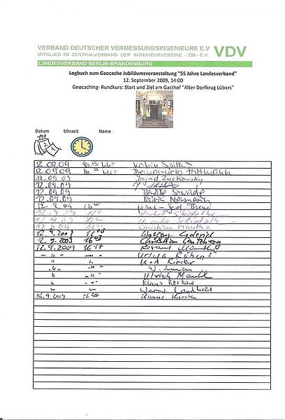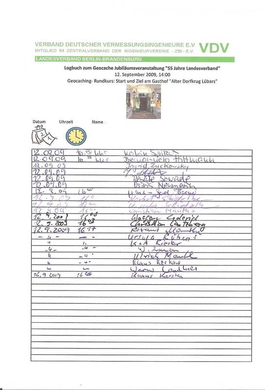 Zum 55-jährigen VDV-Jubiläum in Berlin wurde am 12. September 2009 unter dem Motto „Umsonst und Draußen" gefeiert. Das Angerdorf Lübars im Norden Berlins mit seinen Feldern und Wiesen und dem ursprünglich gebliebenen Dorfanger war Inspiration genug, einmal ein etwas anderes Fest zu wagen. Begonnen wurde mit einem Geocaching, einer modernen Art der Schnitzeljagd. Wanderschuhe waren hier für die zahlreichen Teilnehmer von Vorteil, denn es ging durch Feld und Flur. Auch für erfahrene Berufskollegen war diese Art der Anwendung des GPS-Dienstes eine neue Erfahrung, die im Freizeitbereich immer populärer wird und somit auch schon einen eigenen Wirtschaftszweig entstehen ließ. Erfahrene Geocacher haben hierbei schon erstaunliche Fähigkeiten im Umgang mit den verschiedensten Koordinatensystemen entwickelt.