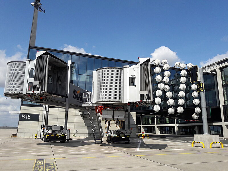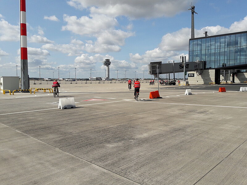 Das Vorprogramm startete gegen 13.30 Uhr mit einer geführten Fahrradtour über das Flughafengelände. Etwa 15 Teilnehmer fanden sich ein, um unter fachkundiger Leitung einer Flughafenmitarbeiterin das Flughafengelände zu erkunden. Zunächst ging es durch die Sicherheitskontrolle, danach befuhren die Teilnehmer das Vorfeld des Flughafens. Aus nächster Nähe wurde der künftige Stellplatz für den Airbus A380 besichtigt. Auch Kunst am Bau gab es dabei zu sehen, so hängt an einem der Flugsteige eine überdimensionale Perlenkette.