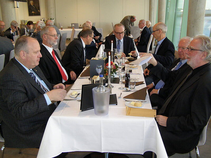 Während der gemeinsamen Mittagstafel und der anschließenden Kaffeetafel wurden viele Gespräche, die Themen der letzten Jahre beinhalteten, in einer sehr angenehmen Atmosphäre geführt. Hierzu trug nicht nur der strahlend blaue Himmel, sondern auch die nicht ganz alltägliche Kulisse vor den Fenstern des Restaurants; an der Pier dem Hotel gegenüber lagen die Atair, die Komet und die Wega, die drei Vermessungs-, Wracksuch- und Forschungsschiffe des Bundesamtes für Deutsche Seeschifffahrt und Hydrographie.