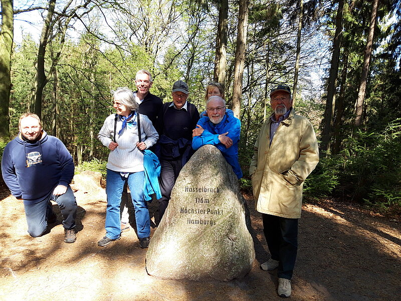 Nach kurzem Stopp und Fotoshooting ging es weiter Richtung Hasselbrack, dem höchsten Punkt Hamburgs. Nun wurde es etwas anstrengender da der Wanderweg stellenweise durch Regen ausgewaschen war, und eine Steigung vom insgesamt 80 m überwunden werden musste. Für uns Norddeutsche eine beträchtliche Höhe. Nach etwa 2 km war es geschafft und unsere Gruppe stand stolz auf dem Hasselbrack. Der Hasselbrack ist mit 116,2 m die höchste natürliche Erhebung in Hamburg und liegt an der Grenze zu Hamburg und Niedersachsen. Der Markierungsstein ersetzt seit 2013 das ehemalige Gipfelkreuz. Eine kleine Pause und der wunderschöne Blick hangabwärts in den Buchenwald belohnte für die Mühe. Ein Gruppenfoto und natürlich der Eintrag ins Gipfelbuch durften nicht fehlen.