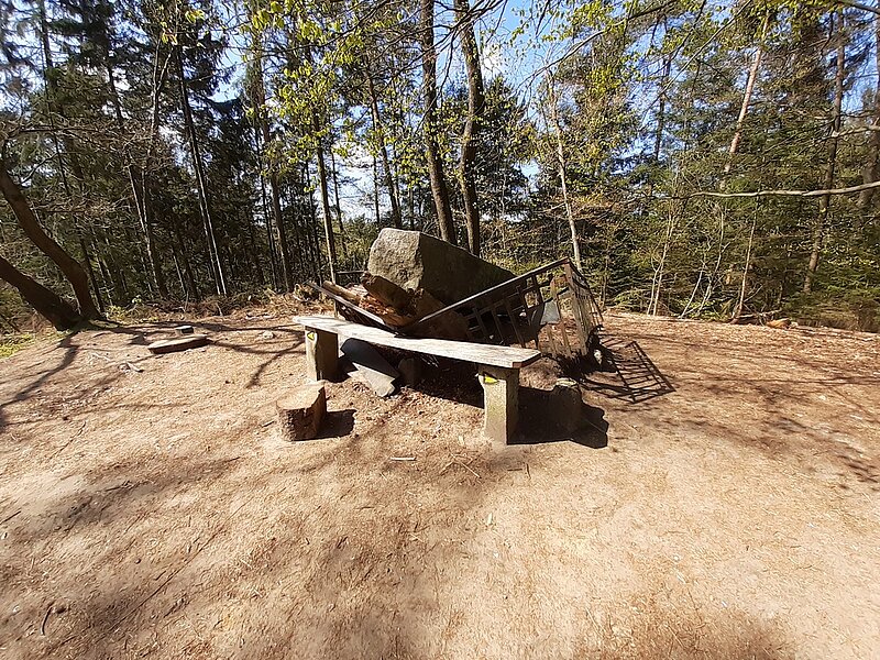 Weiter ging es zum Paul-Roth-Stein. Es mussten so einige Höhen und Tiefen überwunden werden um die Anhöhe von 131m über NN zu erreichen. Es handelt sich hier laut Inschrift um einen Gedenkstein für einen „Wanderer, Freund der Heide und des Waldes“. Paul-Roth war nicht nur ein Wanderfreund, er war auch 35 Jahre lang Vorturner der Hamburger Turnerschaft von 1816. Der ca.1,7m hohe Gedenkstein war sichtlich vor längerer Zeit umgestürzt und noch nicht wiederaufgerichtet worden.