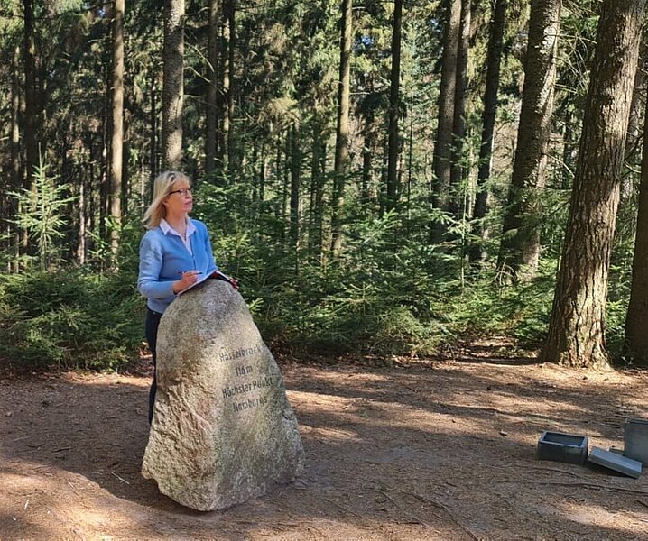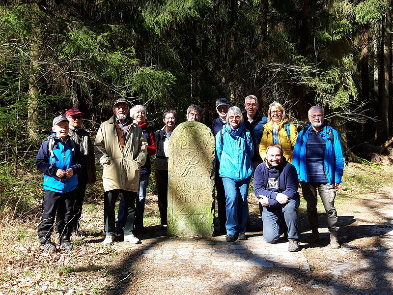 Die Wanderung im Süden von Hamburg startete bei gutem Wetter am Parkplatz „Wildpark Schwarze Berge“. Sie stand ganz im Zeichen der Vermessung. Das erste Ziel, der Moisburger Grenzstein von 1750 wurde nach ca. 2 km erreicht. Er markierte einen Grenzpunkt der damaligen königliche Forstgrenze zwischen Hamburg und Niedersachsen. Die eingemeißelten Initialen von König Georg II von England und Irland, sowie des Kurfürsten von Braunschweig-Lüneburg dokumentieren dies. Er wurde 1933 von seiner ursprünglichen Stelle auf der Ostseite des Forstweges auf seine heutige Position versetzt. Ursprünglich gab es 65 Grenzsteine die die damalige Ostgrenze zwischen Staatsforst und Bauernwald markierten.