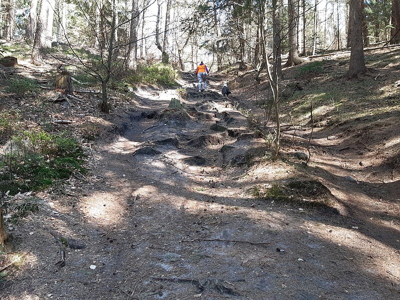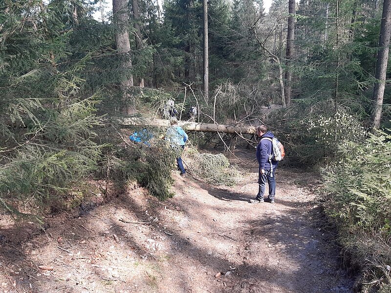 Um dem geplanten Wanderweg folgen zu können mussten nun so einige umgestürzte Bäume überwunden werden. Zur Orientierung wurde das ein oder andere Mal auch das Smartphone mit seinen Tools zur Hilfe genommen. Es ging so einige Male bergauf und bergab bis der „Wanderparkplatz am Rosengarten“ passiert werden konnte.