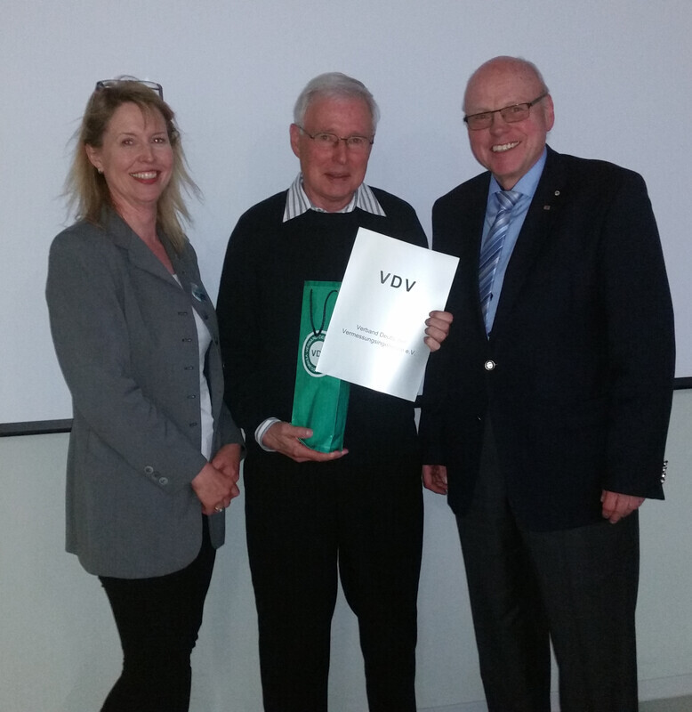 Zur anschließenden Mitgliederversammlung konnten wir den Vizepräsidenten unseres Verbandes Dipl. Ing. Klaus Meyer-Dietrich und unseren Geschäftsführer Dipl.-Ing. Burkhard Kreuter begrüßen. Der Vizepräsident ließ es sich nicht nehmen die Urkunde einschließlich der silbernen Verbandsnadel mit Kranz für die 50-jährige Mitgliedschaft im VDV unserem Schatzmeister im Landesverband, Dipl.‑Ing. Wolfgang Krause zu überreichen. Anlass, um einen kurz 50 Jahre zurückzuschauen. Angefangen hatte Wolfgang Krause mit der Logarithmentafel, dem Messband, Prisma und Lot. Aufgehört hat er mit PC, Digitalnivellier und Totalstation.