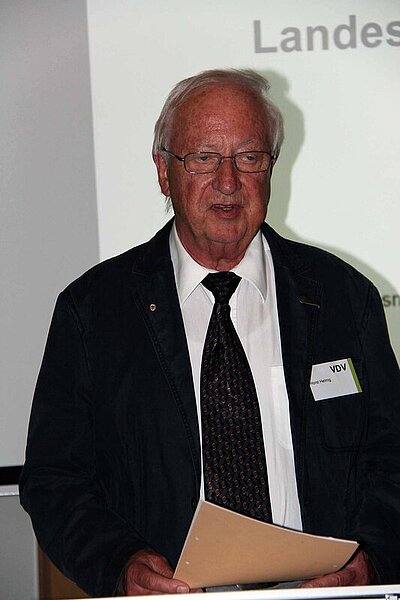 Nach Genehmigung der Tagesordnung durch die Mitgliederversammlung standen zahlreiche Ehrungen an. Für 50jährige Mitgliedschaft ehrten Burkhard Kreuter und Bernd Sack den Kollegen Gerhard Zenth, für 40jährige Mitgliedschaft Maria-Elisabeth Schäfer und Wolfgang Krichbaum sowie für 25jährige Mitgliedschaft Lutz Röpel, Frank Paprocki, Udo Grenzebach, Reinhold Frommelt und Markus Schwobe. Eine besondere Art der Ehrung und Anerkennung sollte Horst H. Helmig zuteilwerden. Für sein langjähriges Engagement, die unermüdliche Arbeit und Ausdauer im Landesverband hatte der Vorstand in seiner letzten Sitzung beschlossen, den Kollegen Horst H. Helmig zum Ehrenlandesvorsitzenden zu benennen. Horst H. Helmig war in 3 Perioden in den Jahren 1977 bis 1988 Landesvorsitzender, von 1983 bis 1988 auch stv. Bundesvorsitzender und von 1987 bis Dez. 1988 Referent für Kommunikation im Bundesvorstand. Seit 1971 ist er Funktionsträger im VDV Hessen, er war Gründungsmitglied des Bezirks Hessen-Mitte in Gießen im Jahre 1971. 1985 wurde er mit der Goldenen Verbandsnadel geehrt. Bis heute ist er langjähriger Landesschatzmeister. In seiner Amtsführung fielen viele für den Landesverband wichtige und berufsständische Entscheidungen. Dazu zählen u.a.: