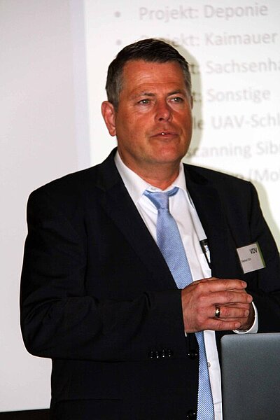 Multisensorik zur Datenerfassung, lautete das Thema des ersten Fachvortrages. Es referierte Dipl.-Ing. (FH) Stephan Och; Geschäftsführer der TPI Vermessungsgesellschaft mbH. Die TPI mit Sitz in Dreieich, Landkreis Offenbach, wurde im Jahr 2000 gegründet. Sie hat ca. 30 Mitarbeiter und besitzt 10 vollausgestattete Messfahrzeuge. Zu ihrem Kundenstamm gehören u. a die Fraport AG, die BASF und die SE mit Einsatzgebieten in der Rhein-Main-Neckar-Region, in ganz Deutschland und auch weltweit (Türkei, Südafrika, Nambia u.a.). Die TPI bietet Leistungen aus allen Bereichen der Vermessung: Ingenieur- und Industrievermessung, 3D-Laserscanning, GIS/CAD, Photogrammetrie und UAV-Befliegung, Gutachten und Sachverständigenwesen. Zu ihrem Erfahrungspotenzial zählen: Laserscanning seit 2006 (mehrere 10.000 Scans) und der UAV-Einsatz seit 2014 bei einer Vielzahl von Projekten. Eingesetzt wird innovative Sensortechnik: NavVis M3 Trolley, HDS 7000/P 40/Imager 5010C/BLK 360, Aibot X6 V2/Multirotor Eagle G4, Lasertracker AT 401. Was ist die Multisensor Meßtechnik: Sie nutzt die Vorteile und Stärken von mehreren Sensoren, um Geodaten (Digitalisierung) vollständig zu erfassen. Die Vorteile sind dabei: Kombination von Vermessungssensoren, Verknüpfung der Ergebnisse, effiziente Produkterstellung, Qualitätskontrolle durch unterschiedliche Messsysteme und ein weites Spektrum an Ergebnissen.
