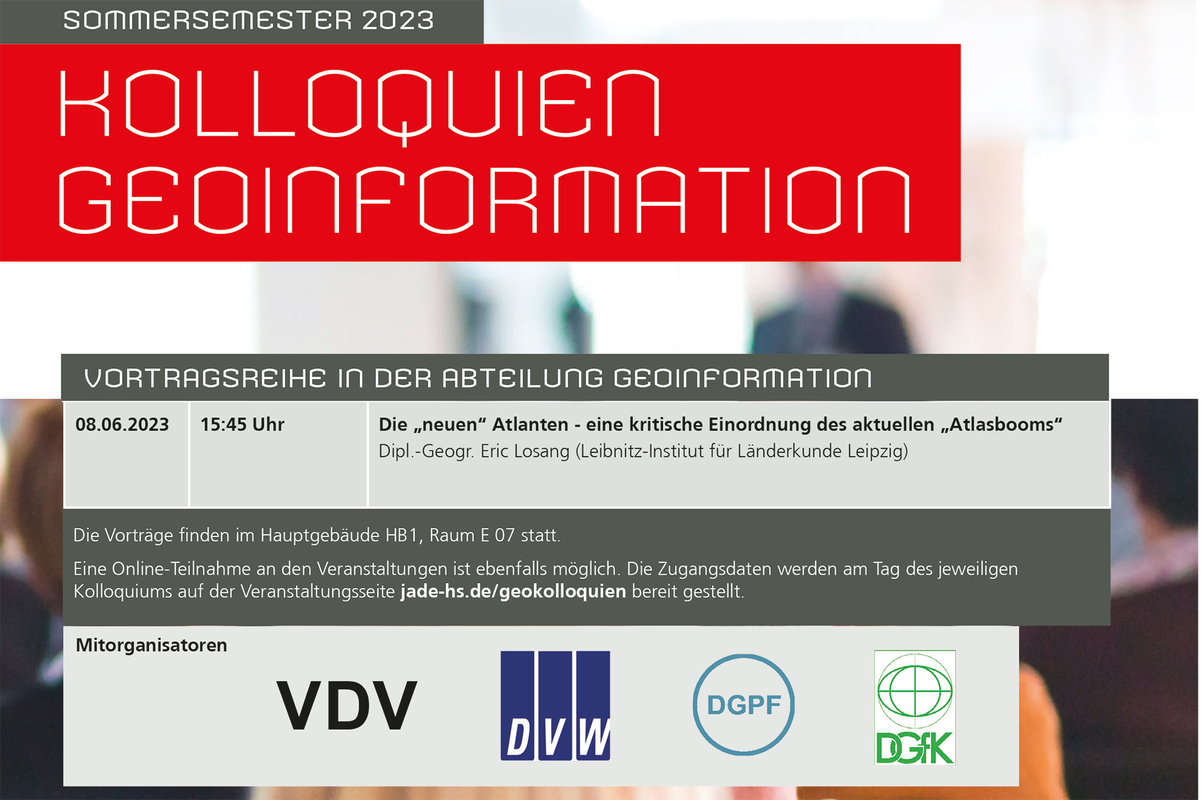 Die Kolloquien Geoinformation an der Jade Hochschule werden vom Fachbereich Bauwesen Geoinformation Gesundheitstechnologie in Zusammenarbeit mit dem Verband Deutscher Vermessungsingenieure e.V. (VDV), der Bezirksgruppe Oldenburg-Bremen des Deutschen Vereins für Vermessungswesen (DVW), der Deutschen Gesellschaft für Photogrammetrie, Fernerkundung und Geoinformation (DGPF) und der Deutschen Gesellschaft für Kartographie (DGfK) veranstaltet.