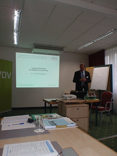 In seinem Bericht ging der Landesvorsitzende auf die Landesvorstandsarbeit der letzten 2 Jahre ein. Gemeinsam mit BDVI und DVW wurde zur Intergeo in Hannover ein Coinrennen (Geocachingrennen) durchgeführt. Im Rahmen der Verteilung der Coin als Startmöglichkeit für das Coinrennen konnten Kontakte zu Allgemeinbildenden Schulen und Berufsschulen geknüpft bzw. vertieft werden.