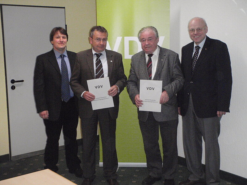 Im Rahmen des Tagesordnungspunkts Ehrungen konnten zwei anwesende Mitglieder für Ihre langjährige Mitgliedschaft geehrt werden. Herr Dipl.-Ing. Hartmut Hellermann wurde vom Vizepräsidenten für seine 50-jährige Mitgliedschaft und Herr Dipl.-Ing. Gerhard Kaupa für die 40-jährige Mitgliedschaft im VDV ausgezeichnet. Den leider nicht anwesenden Jubilaren werden die Urkunden und Nadeln für 40- und 25-jährige Mitgliedschaft auf dem Postwege zugesandt.