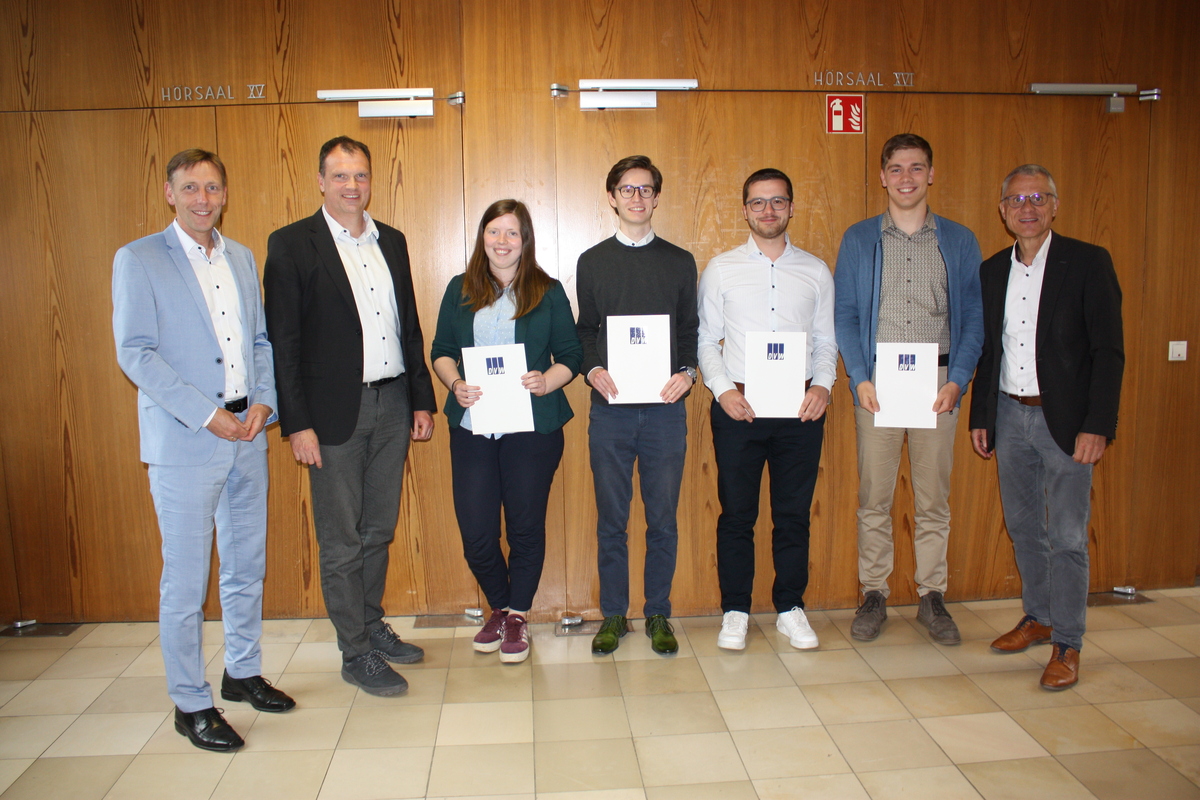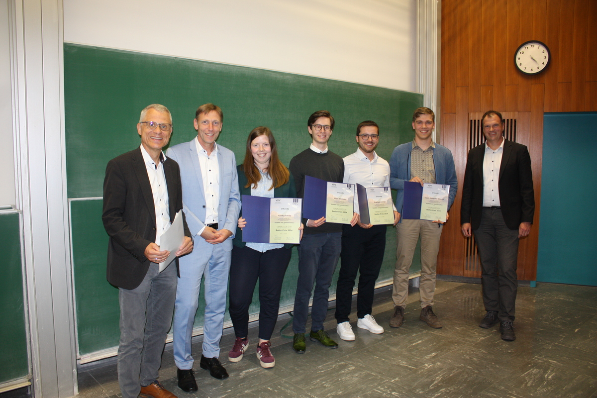 Am 5. Juni 2025 verliehen Andreas Wizesarsky (Vorsitzender des DVW NRW e.V.) und Ulf Meyer-Dietrich (Landesvorsitzender NRW des VDV) erstmalig an der Universität Bonn den "Besten-Preis". Wurden die besten Absolventinnen und Absolventen bisher nur vom DVW NRW e.V. ausgezeichnet, soll zukünftig ein gemeinsamer Preis der berufsständigen Vertretungen verliehen werden. Im Rahmen des Geodätischen Kolloquiums am Institut für Geodäsie und Geoinformation erhielten Raphael Deimel und Leon Alexander Schmidt die Auszeichnung für ihre herausragende Leistungen im Bachelor-Studiengang. Annika Tobies und Kilian Trimborn wurden für Ihren Master-Abschluss geehrt. Bereits vor dem Kolloquium kamen die Preisträger und die Vorsitzenden der Berufsverbände in der Bibliothek des Instituts zusammen und tauschen sich gemeinsam mit dem geschäftsführenden Direktor des Instituts, Prof. Dr. Heiner Kuhlmann, über das Studium und die weiteren Pläne aus. Dabei durfte auch schon auf den Preis angestoßen werden. Der DVW NRW e.V. und der VDV NRW wünschen allen Absolventinnen und Absolventen alles Gute für die Zukunft.
