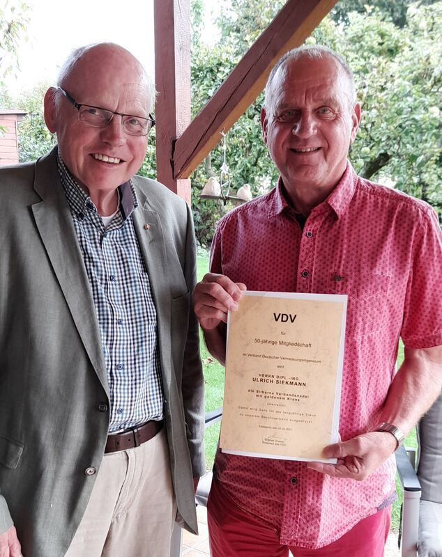 Der Ehrenlandesvorsitzende des Landesverbandes Nordrhein-Westfalen, Klaus Meyer-Dietrich, überreichte im eigenen Garten die Urkunde und Ehrennadel für 50 Jahre Mitgliedschaft im VDV an Ulrich Siekmann. Von seinen 50 Jahren im VDV war Ulrich Siekmann 47 Jahre aktiv in die Verbandsarbeit eingebunden – zunächst als Beisitzer im Bezirksvorstand des Bezirk Düsseldorf. Ab 1977 brachte er sich zunächst als sogenannter Obmann, später als Referent für die Belange der Angestellten im Öffentlichen Dienst in die Arbeit des Landesvorstandes ein. Ende des Jahres 2020 hat Ulrich Siekmann auf eigenen Wunsch dieses Amt aufgegeben.