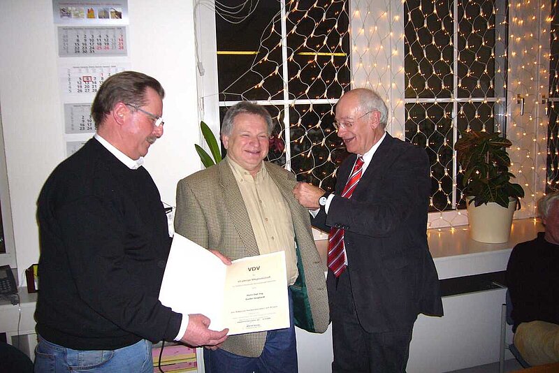 Die Kollegen Dipl.-Ing. Volker Wolf und Dipl.-Ing. Karl Schröder waren verhindert, so dass ihre Urkunde für 25 jährige Zugehörigkeit im VDV nachgereicht werden.