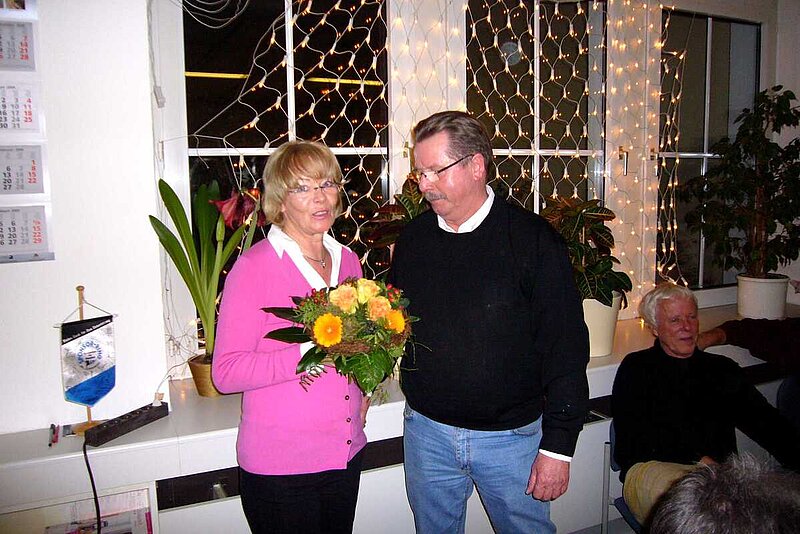 Im Anschluss übergab Volker Brand einen Blumenstrauß an "seine Rechte Hand", Frau Karin Uhlemeyer, als Dank für all die tatkräftige Unterstützung, welche sie im letzten Jahr für die VDV-Bezirksgruppe Bielefeld geleistet hatte.
