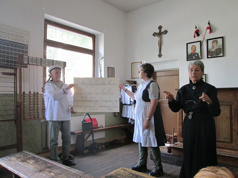 Ein strenges „Fräulein Lehrerin“ nutzte das Umfeld von Schiefertafel und Griffel, Tintenfass und Rohrstock, Katheder und Kaiserbild, um den Schulalltag um 1900 im Erdgeschossklassenraum der früheren Katterbacher Volksschule sehr authentisch darzustellen. Ein hohes Lehrerpult, sehr enge Bankreihen, Wandtafel, Harmonium, Eisenofen, Holzboden, alte Landkarten und dazwischen unser „Fräulein Lehrerin“. Ihr wichtigster Satz „das Sprechen in ganzen Sätzen“ und ein ständiger Hinweis, dass jeder Satz mit „Fräulein Lehrerin" zu beenden sei. So wurden wir in unterschiedlichen Fächern unterrichtet, wie es damals so üblich war. Das geschah mit unterschiedlicher Aufgabenstellung, da ja die 1. bis 4. Klasse zusammen in einem Raum saßen und alle beschäftigt werden mussten. Das „Fräulein Lehrerin“ durfte bis zum Jahr 1951 nicht heiraten, da sonst die Entlassung drohte.
