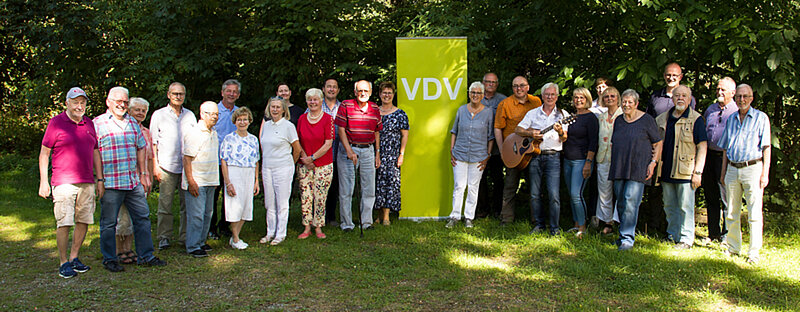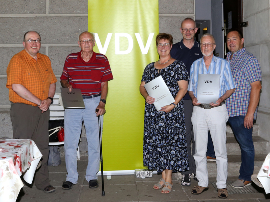 Ulrich Rosen hatte, bedingt durch die Anmeldungen erkannt, dass vier Jubilare, die teilweise schon vor zwei Jahren hätten geehrt werden sollen, in unseren Reihen saßen. Da mit Achim Dombert ein Bundesvorstandsmitglied anwesend war, bat ihn Ulrich Rosen die Mitgliederehrung vorzunehmen, was er gerne übernahm. Er überreichte die Urkunden und Sticker für 25 Jahre Mitgliedschaft an Kirsten Rosen, für 40 Jahre an Ralf Pitzen und für 50 Jahre (inzwischen schon 52 Jahre im VDV) an Manfred Hohberg und Wolfgang Janders. 25 gratulierende Teilnehmer waren eine schöne Kulisse für die Geehrten.