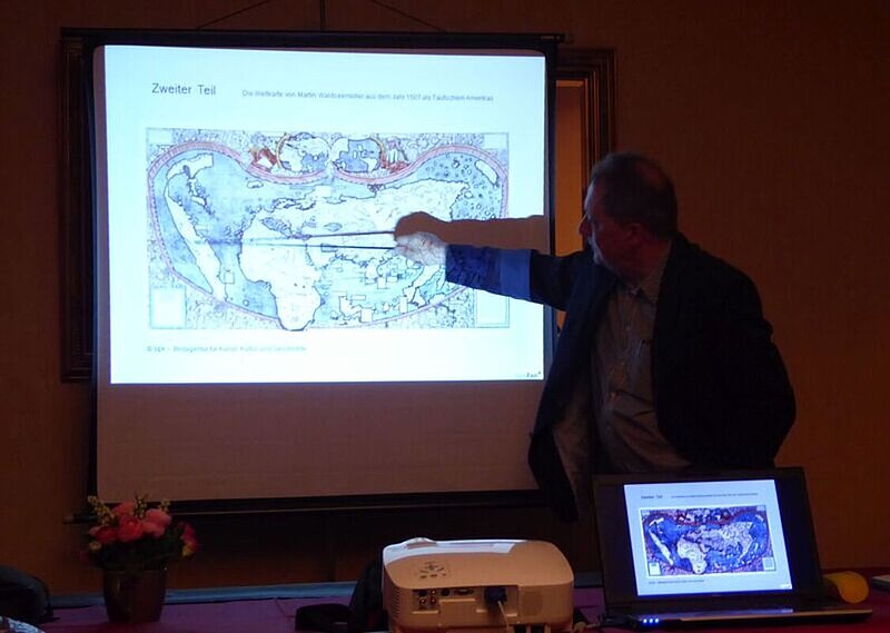 Die kartographiehistorische Umschau von Uwe Schwarz, der sein Büro „GeoFan“ in Bensberg betreibt, beeindruckte alle Zuhörer und ermunterte sie, in dem von ihm herausgegebenen Buch über die vier Seefahrten des Amerigo Vespucci „Neue Welt Mundus Novus“ in der Edition Erdmann 2014 die Entdeckungsgeschichte Amerikas zu vertiefen.
