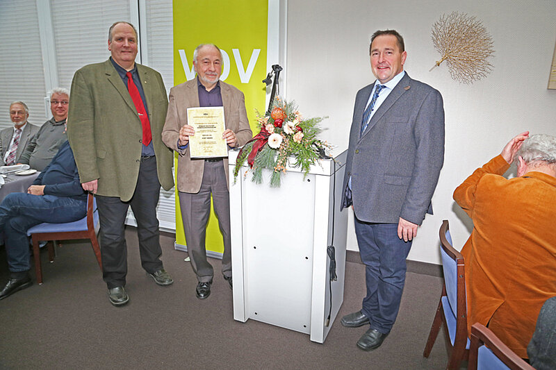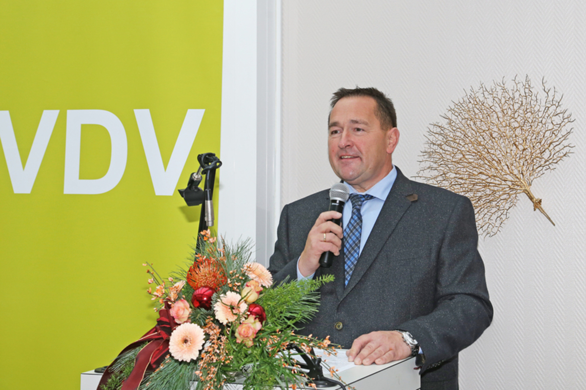 Burkhard Kreuter überbrachte die Glückwünsche des VDV-Bundesvorstandes und bedankte sich beim aktiven Vorstand für die anerkannt gute Arbeit für das Vermessungswesen. Im Anschluss an seine Begrüßung ehrte er Kurt Andrä zum Ehrenbezirksvorsitzenden, der von 1990 bis 2016 1. Vorsitzender des VDV-Bezirks war.