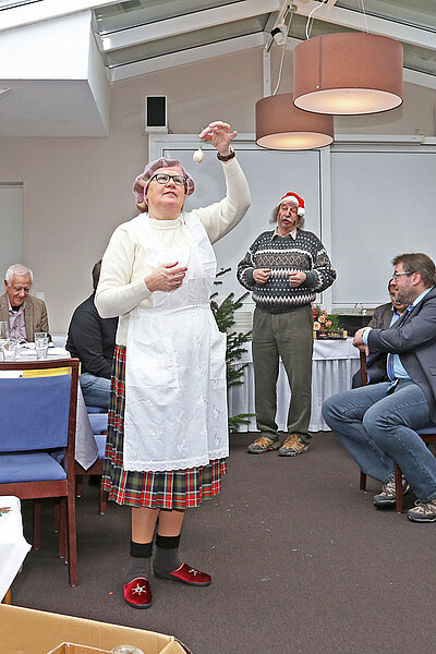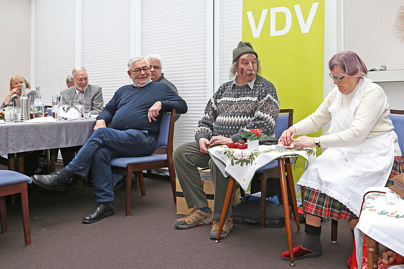 In besonderer Verbundenheit zum VDV-Bezirk Bonn seit Mitte der 70-er Jahre, hier hatte er an vielen VDV-Reisen teilgenommen, gratulierte Willibald Dores aus Worms zum Jubiläum: „Ein Gesicht bekam der VDV für mich erst durch Euch, die VDV-Freunde hier im Bezirk Bonn“. Im Rahmenprogramm am Nachmittag begeisterten Elisabeth und Karl-Friedrich Schleier mit ihrem rheinischen Duett „Eine schöne Bescherung“. Manche, die dem rheinischen Dialekt nicht (mehr) ganz so sicher sind, mussten manchmal schon genauer hinhören, aber die Mimik der beiden Vortragenden war so eindeutig, dass alle den Spaß verstanden haben.