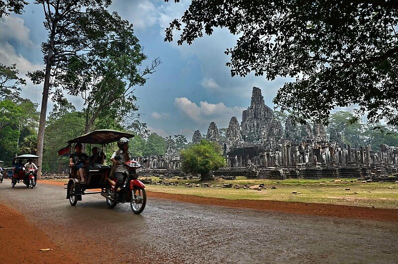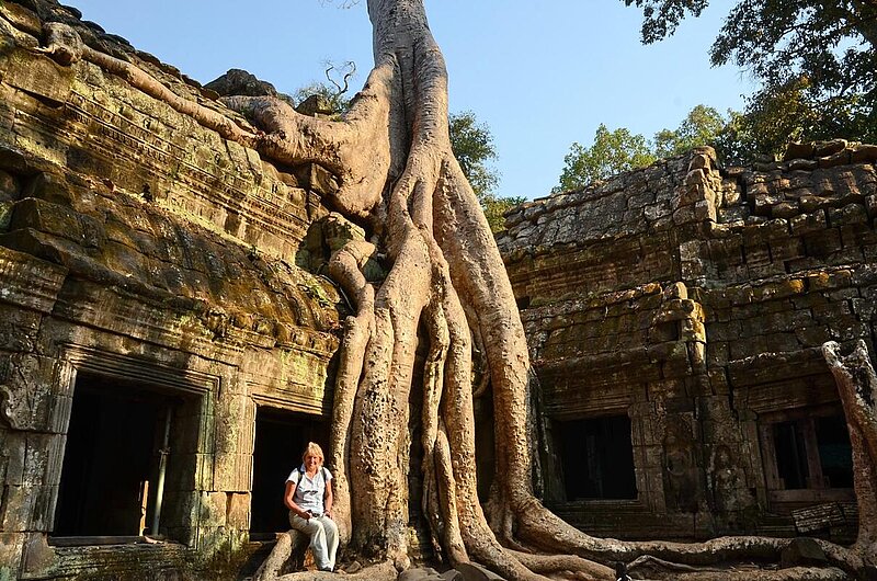Ausgangspunkt der Rundreise war Bangkok. Die Hauptstadt des Königreichs Thailand und mit Abstand die größte Stadt des Landes erkundet man am besten per Boot. Die Metropole bietet alles von altertümlichen Tempelanlagen bis hin zu modernen Hochhäusern. Nach 3 Tagen ging es auf dem Landweg weiter Richtung Kambodscha. Mit dem Bus fuhren Sie über die Grenze in das 10 Stunden entfernte Siem Reap. Von hier aus wurden die weltberühmten Tempelanlagen von Angkor erkundet. Diese Region bildete vom 9. bis zum 15. Jahrhundert das Zentrum des historischen Khmer-Königreiches Kambuja. Der wohl bekannteste und auch größte Tempelkomplex der Welt ist Angkor Wat. Die gewaltigen Bauten aus kunstvoll gestaltetem Sandstein sind schon lange kein Insidertipp mehr. Neben zahlreichen Touristen ist die Anlage auch bei buddhistischen Mönchen sehr beliebt und teilweise sehr überlaufen. Auf Grund der hohen Tagestemperaturen und der weiten Wegstrecken wählten Göckes eine sehr komfortable Moped-Rikscha als ideales Beförderungsmittel. So konnten beide entspannt auch die Anlage Angkor Thom mit den 16 Gesichtstürmen besichtigen. Ein kleiner Geheimtipp ist der Gebäudekomplex Ta Prohm. Diese aufgegebene Tempelanlage wurde so belassen, wie man sie einst vorgefunden hat. Besonders eindrucksvoll sind hier die Feigenbäume, deren Wurzeln ganze Gebäude überwachsen.