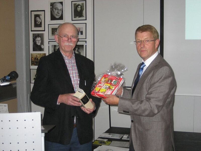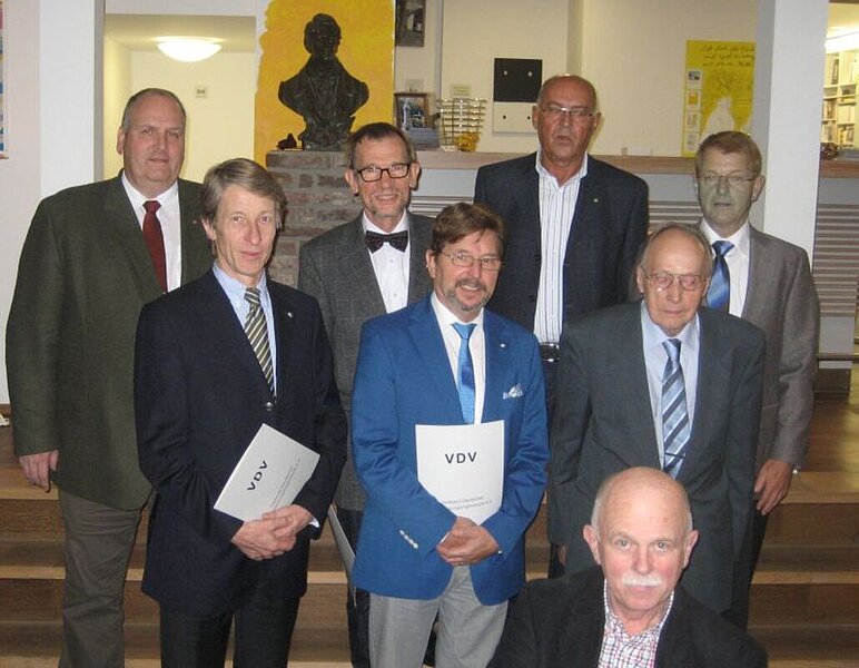 Bundesgeschäftsführer Burkhard Kreuter ehrte unsere Jubilare, die durch viele Jahre der Treue und Verbundenheit zu Ihrem VDV-Bezirk zum Gedeihen des Verbands beigetragen haben: Götz Richter für 50-jährige Mitgliedschaft und die Kollegen Winfried Cornelius, Wolfgang Koch, und Werner Ziob für 40-jährige Mitgliedschaft. Zur großen Freude aller war auch das Gründungsmitglied Karl Schindler heute dabei, der bereits am 1. Mai 1949 in Essen mit der Mitgliedsnummer 80 dem VDV beitrat. Zur Erinnerung überreichte Ihnen der Bezirksvorsitzende einen signierten und gestempelten ‚Bendemann’. Die Jubilare (40) Ralf Edelmann, Horst Mühlmann und Adrianus van Zijl hatten abgesagt.