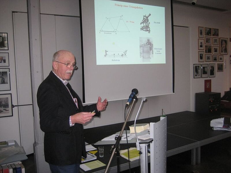 In seinem Festvortrag zu seinem Buch ‚Preußens letzte Kette – aus dem Reisetagebuch des Hauptmanns Bendemann’ bot Prof. Dr. Ing. Hans Fröhlich humorvoll unterhaltsame Vermessungsgeschichte. Angefangen hat alles damit, dass ihm als Dezernent für den trigonometrischen Außendienst beim Landesvermessungsamt Nordrhein-Westfalen das Erkundungstagebuch (550 Seiten in Sütterlin-Schrift,) von Hauptmann Hans Bendemann in die Hände fiel. Dem war als kaiserlicher Vermessungsdirigent der königlich Preußischen Landesaufnahme beim Großen Generalstab die Erkundung (1886 bis 1889) der Hauptvermessungspunkte in einem 70.000 qkm großen Gebiet, das sich vom Münsterland bis nach Trier und von der belgisch-niederländischen Grenze bis nach Thüringen erstreckte, befohlen worden.