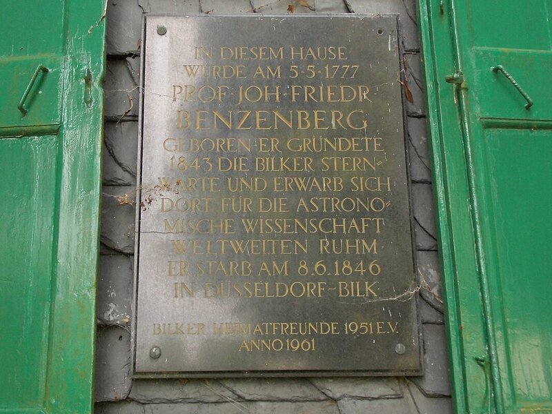 Einige im Internet recherchierte Texte und Fotos halfen unsere Neugier zu entfachen: Das ehemalige evangelische Pfarrhaus mit Gedenktafel, wo Johann Friedrich Benzenberg am 05.05.1777 als einziger Sohn eines Landpredigers geboren wurde, fanden wir etwas abseits der Kirche. Benzenberg studierte von 1795 bis 1797 in Marburg Theologie, widmete sich aber dann in Göttingen der Astronomie und Mathematik. Zu dieser Zeit traf er auch Johann Carl Friedrich Gauss. Er promovierte im Jahr 1800 in Duisburg und wurde 1805 im Auftrag des Kurfürsten von Bayern zum Professor der Physik und Astronomie am Lyzeum zu Düsseldorf ernannt, wo er Mathematik lehrte und die auf dem Dach des alten Jesuitenkollegs befindliche kleine Sternwarte bezog. Er gilt als erster rheinischer Liberaler, machte sich durch antipreußische Publikationen (Wünsche und Hoffnungen eines Rheinländers) ebenso einen Namen wie als Landvermesser, Astronom und Meteorologe.