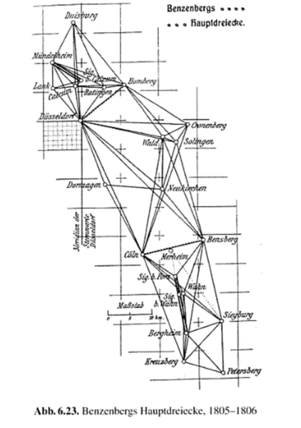 Der Historiker Heinz Gollwitzer schreibt in Neue Deutsche Biographie Band 2 (1955, S. 60): ‚Benzenberg leitete 1805 bis 1810 die Landesvermessung des ehemaligen Herzogtums Berg und erwarb sich durch die geschickte Anlage der Triangulation, vor allem aber durch die Organisation der bergischen Katastervermessung, sowie durch seine Vorschläge für die Einrichtung des geometrischen Unterrichts für das Personal der Landesvermessung anerkannte Verdienste‘. Benzenberg verfasste das grundlegende Werk ‚Handbuch der angewandten Geometrie‘(3 Bände, Düsseldorf 1815). Hervorzuheben ist sein Eintreten für die Messung der Winkel im Dreiecksnetz 1. Ordnung mit dem Spiegelsextanten, sparte es doch aufwändige Signalbauten, aber der Umbruch zu der genaueren Theodolitvermessung fand schon statt.