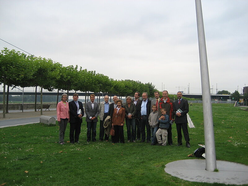,Es freut mich, dass wir heute bei unserer VDV-Exkursion aus erster Hand und berufenem Mund etwas über die Realisierung und die Besonderheiten dieses technischen Wunderwerkes erfahren’, begrüßte der Bezirksvorsitzende Gerhard Vaupel am Mittwoch, den 27. August 2008 den Vermessungskollegen und Stadtbildpfleger der ‚Düsseldorfer Jonges’ Dipl.-Ing. Rolf Töpfer und Dipl.-Math. Willy Bachmann (Viktoria Versicherung AG). Von Ihnen stammen die Idee und der Entwurf der Horizontal-Sonnenuhr. Die geodätische Umsetzung (Bestimmung des Ortes und der Meridiankonvergenz, dreidimensionale Berechnung und Absteckung der Uhrenkonstruktion) führte VDV-Kollege Dipl.-Ing. Horst Mühlmann (Büroleiter Vermessungsbüro R. Töpfer) aus, der leider erkrankt ist.