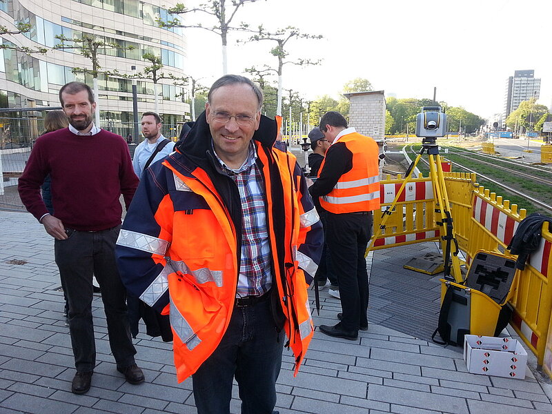 Bezirksvorsitzender Gerhard Vaupel begrüßte die Teilnehmer und beschrieb kurz einige Aspekte der Veranstaltung: ‚Unsere heutige Exkursion ist darauf angelegt, gerade auch Nachwuchs-Geodäten mehr Vermessungspraxis anzubieten. Wenn man auf die Neuordnung der Ausbildungsberufe mit den Lehrzielen Vermessungstechniker und Geomatiker blickt, sind wir alle Fachleute für Geoinformationstechnologie. In der Fachrichtung Vermessung folgt der technologischen Entwicklung ein neues Verständnis von Erhebung, Analyse, Auswertung von Daten. ‚Alltägliche‘ Vermessungsausrüstungen werden - innerhalb der üblichen Arbeitsabläufe - über Lösungen für herkömmliche Aufgaben bis hin zu komplexen 3D-Modellierungen verfügen‘.