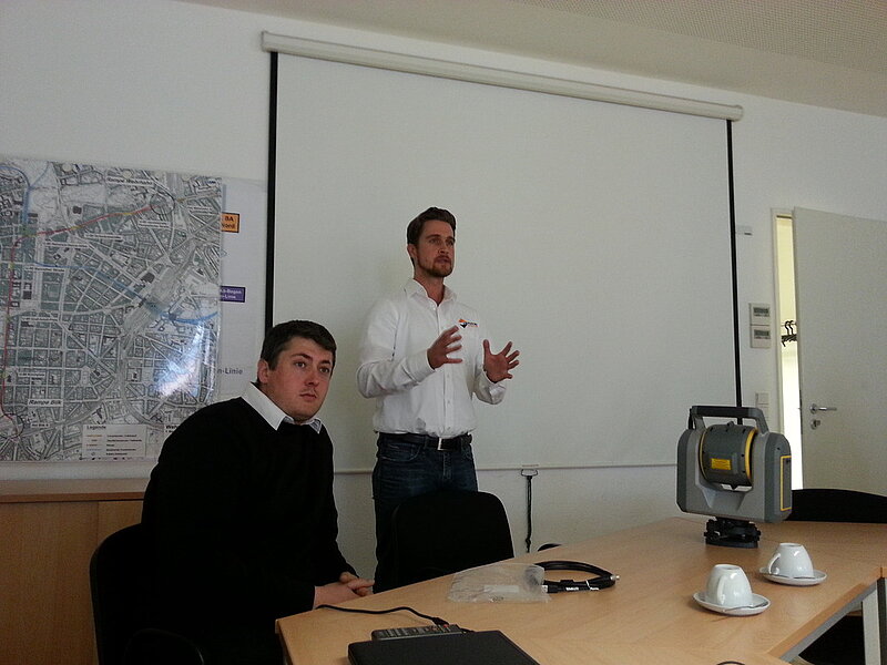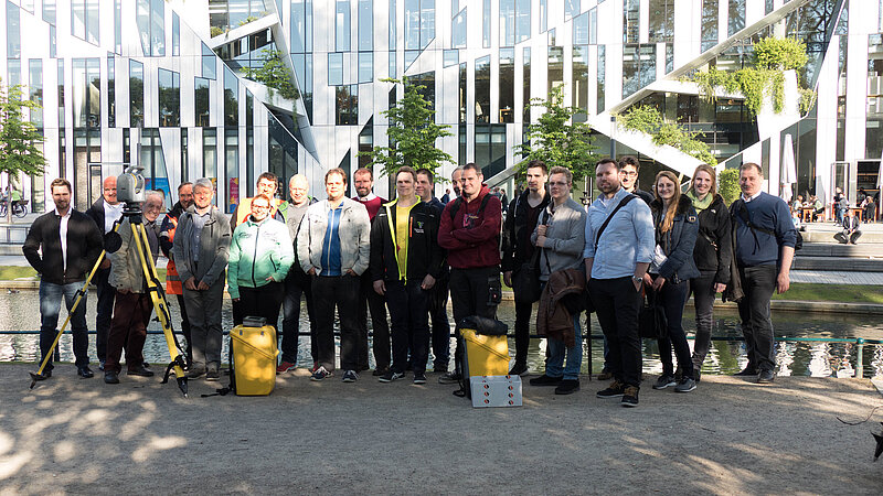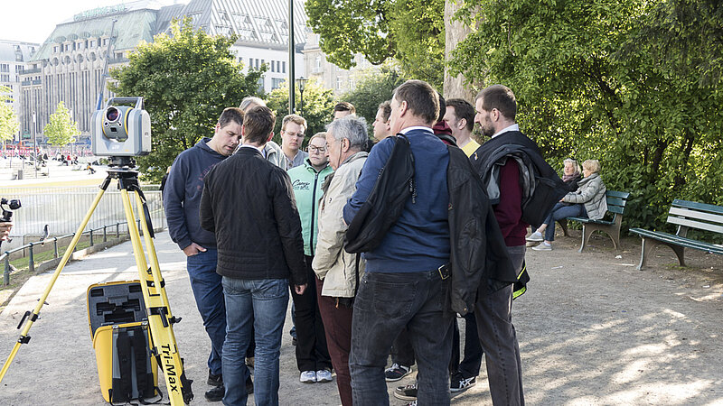 Die Mess-Objekte wurden bei Sonnenschein fußläufig in wenigen Minuten erreicht: Ein ‚Cut‘ in der Fassade und die Dachverbindung über der Piazza des Kö-Bogens (Architekt Daniel Libeskind), die ‚Goldene Brücke‘ zum Hofgarten mit ihren Jugendstilelementen und die Gleise an dem neuen Rheinbahn-Haltepunkt waren in ihrer komplexen Formenvielfalt zu erfassen. Durch zwei verfügbare Messausrüstungen konnten sich die Teilnehmer nach fachlichem Interesse aufteilen und zwischenzeitlich auch wieder die Station wechseln. Jeder wurde angeleitet, den Mess- und Auswertevorgang im Felde selbst auszuführen, z. B. auf dem Feld-Tablet-PC die exakte Detail-Anzielung der Totalstation mittels Zoom direkt im Mess-Bild ausführen.