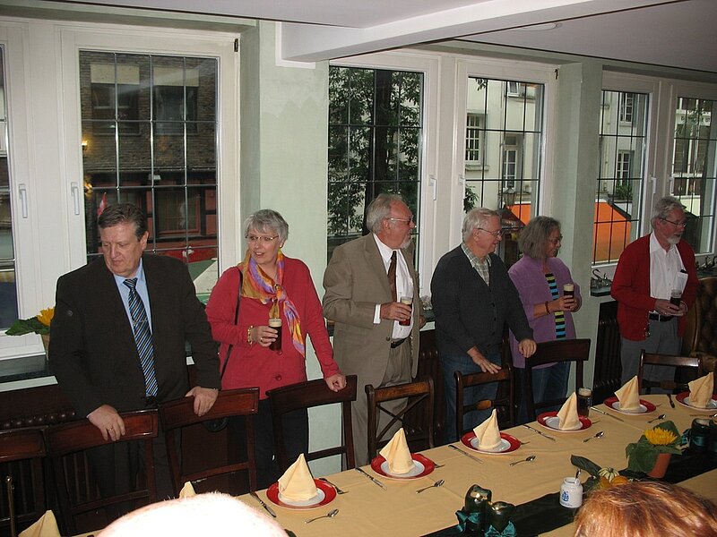 Der VDV-Bezirk Düsseldorf hatte am Donnerstag, den 19. September 2013 zu einer kleinen Jubilarfeier in das ‚Kesselstübchen‘ des Brauhauses Schuhmacher in der Altstadt eingeladen. Die als Vorprogramm und Dankeschön für die Jubilare angebotene einstündige Panoramafahrt auf dem Rhein war freigestellt worden, fand aber überraschend viele Freunde. So trafen sich um 17 Uhr am Anleger unterhalb der Rheinuferpromenade schon mal 20 Kolleginnen und Kollegen inklusive Begleitungen, darunter auch der NRW-Landesvorsitzende Karsten Muth.