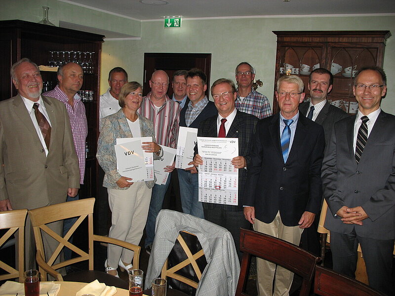 Nach einem Fußweg in das nahe ‚Kesselstübchen‘ sorgten Original Chesterfield Möbel, goldgerahmte Bilder und eine herbstliche Dekoration für Wohnzimmeratmosphäre, wo erst mal Zeit zum Begrüßen, zum Plaudern, für hervorragende Kleinigkeiten aus der Küche und eben auch für ein ‚Latzenbier‘ war. ‚Denn viele der Jubilare sehen sich ja doch eher selten und dann bleibt oft nicht die Zeit für ein gemütliches Beisammensein‘, begründete Bezirksvorsitzender Gerhard Vaupel in seiner Begrüßung die Wahl dieses familiären Rahmens für die Ehrungen. Erfreulicherweise konnten in diesem Jahr eine stolze Reihe der Jubilare unserer Einladung folgen: Landesvorsitzender Karsten Muth ehrte Hans Joeres mit der Übergabe der Urkunde und der Verleihung der goldenen Verbandsnadel mit Kranz für seine 50-jährige Treue zu unserem Berufsverband, Achim Brosch und Gerd Joachim Töpfer für ihre 40-jährige Treue. Ebenso dankte er Gesine Böttcher, Dieter Hansel, Ralf Gromadzki, Karl-Heinz Kawan, Markus Lang, Thomas Nordhoff und Rüdiger Schmidt für ihre 25-jährige Treue und schloss auch die heute leider verhinderten Jubilare mit ein: Dieter Franke (Urlaub) und Hans-Georg Mehlich (Ehrung auf der Bundesmitgliederversammlung) sind 50 Jahre Mitglied, Gero Aschenbroich (Termin) 40 Jahre, Hubert Boers, Michael Dolf, Jürgen Klöckner, Stefan Koehnen, Uwe Sahre, Andreas Schmidt und Holger Stiefermann haben die 25-jährige Mitgliedschaft in unserem Berufsverband erreicht.