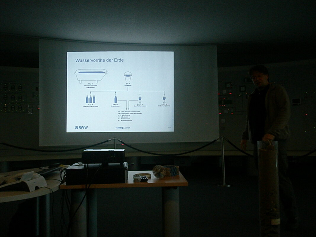 Zu Beginn der Besichtigung stand ein Vortrag über die Aufbereitung von Oberflächenwasser in einem dreistufigen chemisch – biologischem Prozess nach dem „Mülheimer Verfahren“, das den Einsatz von Chlor durch Ozon und Aktivkohlefilter ersetzt.