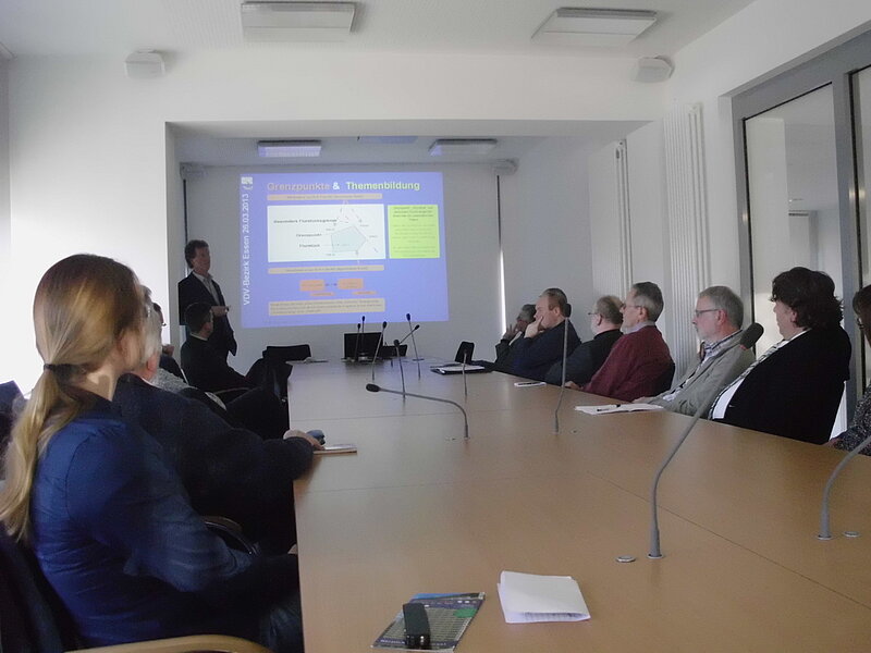 Bezirksvorsitzender Friedrich Koch hatte für eine Bezirksveranstaltung an einem frühen Nachmittag nicht mit so vielen Interessenten gerechnet. Um die Absagen wegen Überfüllung möglichst klein zu halten, hatte der stellvertretende Amtsleiter Klaus Jacobi deshalb kurzfristig für die zwanzig Angemeldeten den großen Besprechungsraum im Technischen Rathaus der Stadt Mülheim an der Ruhr und einen weiteren Expertenarbeitsplatz für die Besichtigung zur Verfügung gestellt. Das Thema war so spannend, dass abends daran erinnert werden musste, dass auch Rathausbeschäftigte irgendwann einmal Feierabend machen müssen. Eine kleinere Gruppe fand sich deshalb noch zu einer Abschlussdiskussion in einem urigen Altstadtrestaurant ein.