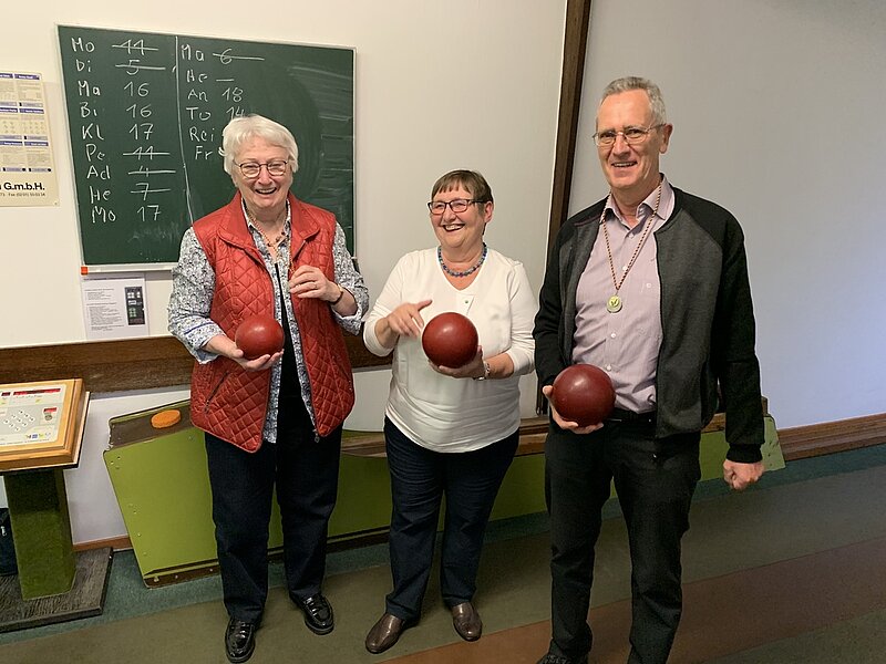 Dass Monika Koch, nach Auswertung der Daten durch Dieter Klemp, die Kegler/innen Toni Schumacher und Marianne Klemp als erfolgreichste Teilnehmer mit einem „Orden am Band“ als Wanderpreis auszeichnete, war wieder einmal eine Demonstration der familientypischen Kreativität und eine klare Ansage, dass Wiederholungen vorgesehen sind.