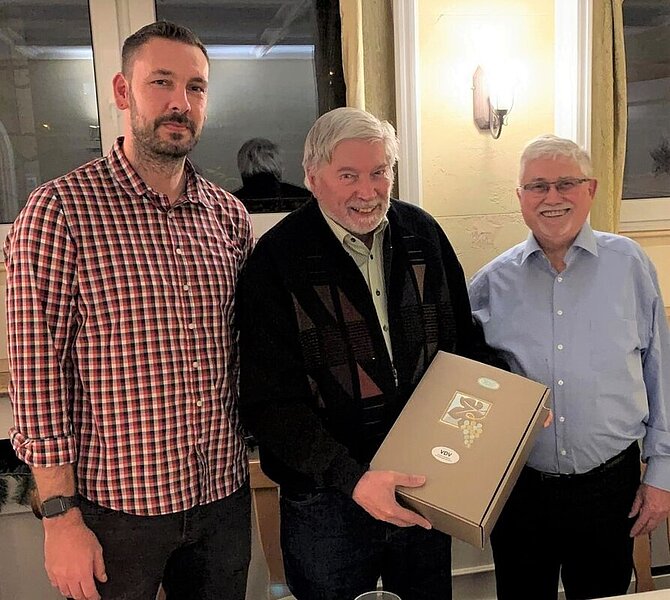 Der neu gewählte Bezirksvorsitzende Christian Landers gratulierte im Namen des Bezirks und übergab ihm als persönliches Geschenk einen Karton lieblicher Spätlesen, was Dieter Klemp ganz besonders zu schätzen weiß.