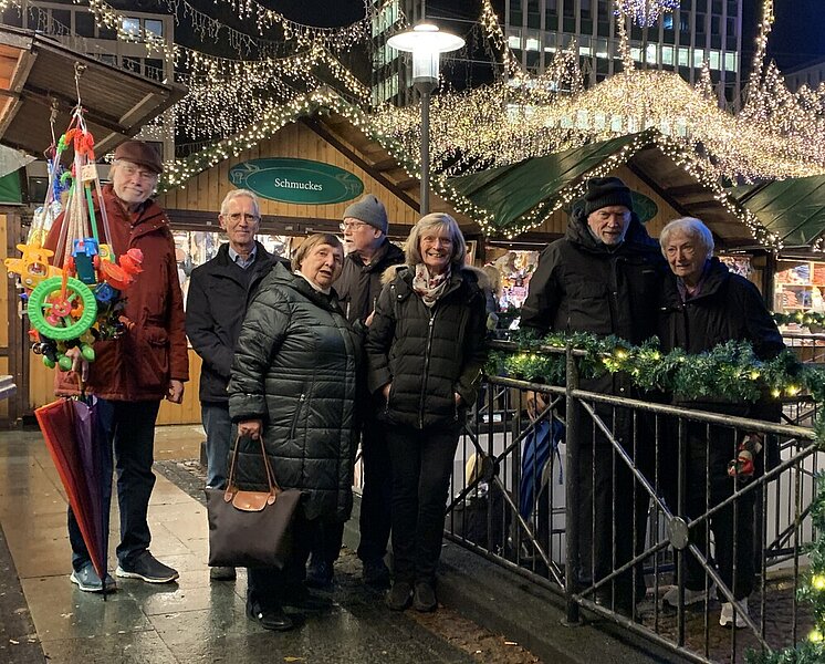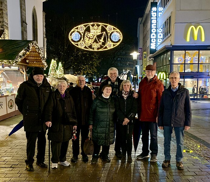 Nach langer Sommerpause hatte der Bezirk Essen am leicht verregneten Dienstag, dem 12.12.2023, zu einem Jahresabschluss-Bummel über den Essener Weihnachtsmarkt eingeladen. Pech gehabt, könnte man meinen, aber trotz des Wetters und einiger Ausfälle durch Corona, trafen sich die Teilnehmer vor dem Essener Dom. Auf das Bummeln wurde dann aber großzügig verzichtet und stattdessen zügig in die wenige Meter entfernte badischen Glühwein-Bude, neben der alten Marktkirche, gewechselt. Den unverzichtbaren, aber in diesem Fall ausgesprochen leckeren Glühwein, gab es sowohl in Rot als auch in Weiß, mit und ohne Alkohol, ausschließlich sortenrein, ohne zusätzlichen Zucker und Schuss. Seinen edlen badischen Tropfen zu panschen, das lehnte die Chefin erbarmungslos ab. Dank heimlicher, unautorisierter Nachbesserung konnte dann aber auch Dieter sein Getränk genießen.