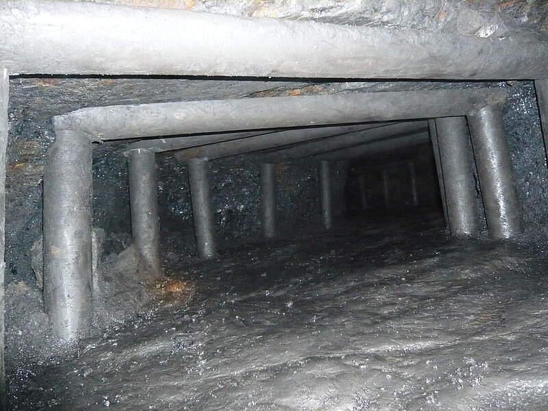 Die Kohlen wurden vermutlich in der damaligen Zeit mit einem Hunt auf einem Schlitten aus dem Bergwerk geschoben. Highlight war der Streb in Flöz Sengsbank mit noch vorhandener Lagerstätte. Die Fortbewegung klappte hier dann auch nicht mehr auf allen vieren, hier half nur noch kriechen. Vor Ort konnte jeder versuchen mit einer Hacke bei 55 cm Ausbauhöhe Kohle zu lösen. Dabei sollte nicht nur Staub und Kleinmaterial produziert werden, sondern brauchbare große Kohlenstücke. Allein im Liegen die Hacke in Kohle zu bekommen ist schon schwierig. Es ist schon beeindruckend unter welchen schwierigen Bedingungen die damaligen Bergleute vor Ort arbeiten mussten. Der Ausflug in das 19. Jahrhundert verging dank der kompetenten Führung wie im Flug. Die Befahrung wird der ein oder andere Kollege in den nachfolgenden Tagen mit ein wenig Muskelkater im Gedächtnis bleiben.