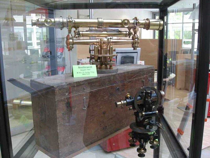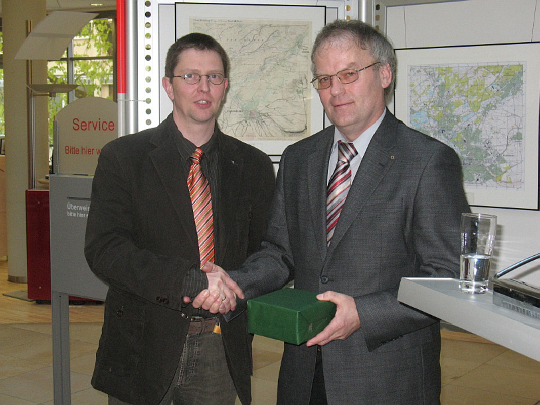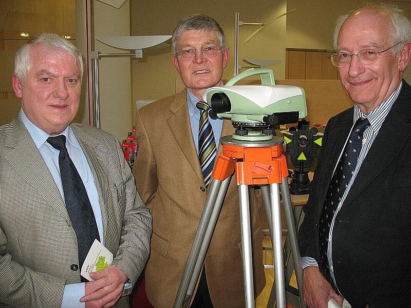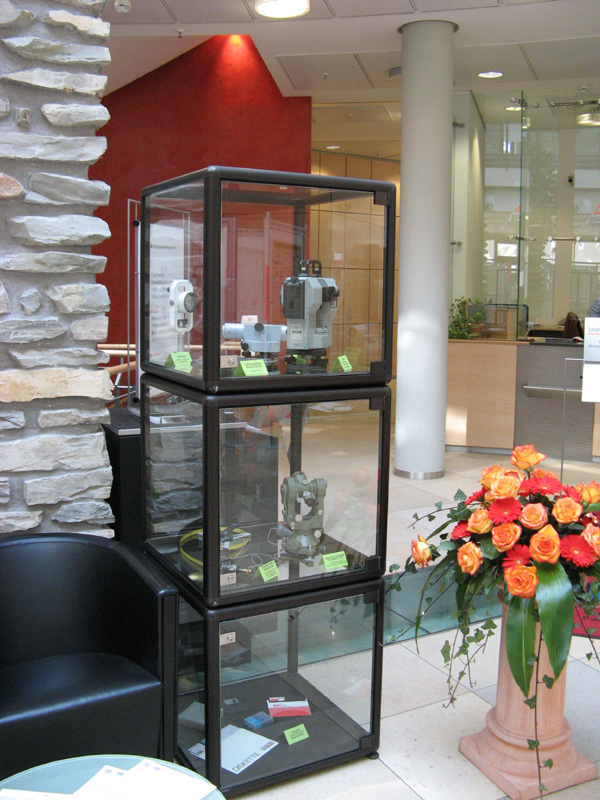 Als weiterer Höhepunkt des Abends wurde in der Sparkasse Paderborn, Geschäftsstelle „Schildern“, eine 14-tägige Ausstellung zum Thema „Vermessung in Paderborn“ eröffnet. Im Kassenraum der größten Zweigstelle der Sparkasse haben die Kollegen eine Reihe Stellwände mit Informationstafeln und Kartenwerken bestückt. Der Besucher erhält einen kompakten überblick über Produkte und Dienstleistungen der Vermessung, sowie über die verschiedenen Einsatzgebiete eines Vermessungsingenieurs oder Geoinformatikers. Zusätzlich werden Organisation, Aufbau und Ziele des VDV und auch die Aktivitäten des Bezirks Paderborn gezeigt. Abgerundet wird die Ausstellung durch eine Vielzahl von Exponaten in insgesamt sieben Vitrinen, die sich mit historischen Instrumenten, Arbeitsmitteln aus den vergangenen Jahrzehnten und Fachliteratur beschäftigen. Während des Abends wurden durch den Kollegen Matthias Rötter Messgeräte der neuesten Generation vorgeführt und den interessierten Kollegen erläutert.