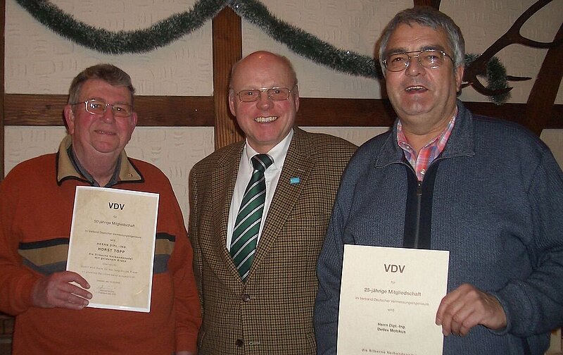 Der Ehrenlandesvorsitzende Klaus Meyer-Dietrich durfte im Rahmen des traditionellen Nikolauskegeln den Kollegen Horst Topp für 50-jährige Mitgliedschaft im VDV mit Urkunde und Ehrennadel ehren. Horst Topp gehört zu den Gründungsmitgliedern des Bezirk Soest und ist seither immer im Bezirk aktiv. Außerdem konnte Detlev Motzkus die Ehrungen für sein 25-jähriges Mitgliedsjubiläum entgegennehmen. In seinen kurzen Ansprachen lies Klaus Meyer-Dietrich die vergangenen Jahre der beiden stets aktiven Mitglieder Revue passieren.