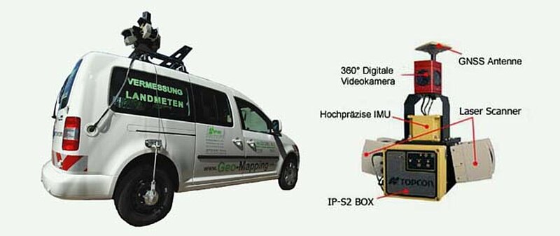 Dieses System ist auf dem Dach eines Spezialfahrzeugs montiert und führt während der Fahrt mit 3D-Laserscannern eine dreidimensionale Vermessung aus. Zusätzlich erfasst eine 360°-Digitalkamera Straßen, Gebäude, Verkehrseinrichtungen und weitere wichtige Details, die für eine 3D-GIS-Kartierung notwendig sind. GNSS-Empfänger und Odometriedaten (Radsensoren) nehmen parallel alle Daten für die Positionierung auf, die in der IP-S2-Box gesammelt und synchronisiert werden. Aufgrund dieser Technik können sogar unter schwierigsten Bedingungen, z.B. in Tunneln, unter Brücken, in stark bewaldeten Gebieten oder in eng bebauten Straßen, Positionsdaten erfasst werden. Die Vermessung wird somit ohne Verkehrsbehinderung, Straßensperrung oder Sicherungsmaßnahmen durchgeführt.